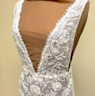 Mathilde Froustey, Principal dancer for SF Ballet, asked me to design and build her wedding dress. She wanted something sexy yet elegant, chic but playful, simple but eye-catching. The design we settled on was a long A-line silhouette with a plunging neckline. It was executed in traditional materials including beaded net, lace, and crinoline, but in a daring way. The skirt, being a single layer of beaded net over translucent nylon crinoline, was just sheer enough for the light to shine through, but hand-appliqued floral motifs were strategically placed all over the torso to obscure any underlying detail. The piece de resistance was the veil, a simple piece of ultra-fine silk chiffon tacked to a clear elastic band that she held tight against her head with her hand. When she arrived at the altar, she released the invisible band and her attendants simply lifted the veil off of her in a full reveal that didn't muss a single strand of her elegant coiffure. She also had me make a jumpsuit in a plunging neckline style very similar to the dress, but made of a stretchy white sequined net of interesting geometric shapes.