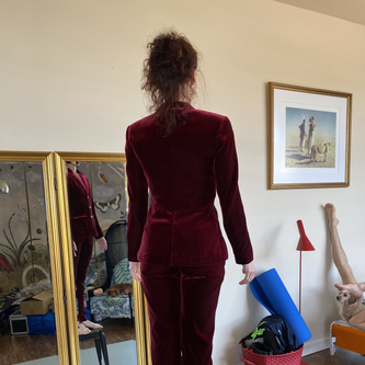 Sofiane Sylve, former principal dancer at SF Ballet, asked me to make a couple of suits for her to take with her to Europe for a new job position. She specifically wanted a maroon velvet suit with hot pink lining for more formal/business affairs, along with a camouflage jumpsuit that she could throw on after dance classes. I used a stretch velvet and a stretch taffeta lining in the suit for maximum comfort, though it gave me extra work structuring the jacket I feel it was worth it. Because this was happening at the beginning of the pandemic quarantine, I was unable to get any camouflage fabric for the jumpsuit. I ended up ordering a huge men's camouflage coverall and took it completely apart to use as raw materials.