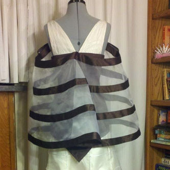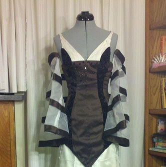 My friend Suzanne Raether wanted a gown based on a character in a novel she wrote, a brown water spider which in North Carolinian Cherokee mythology brought fire to man on its back from an island set aflame by lightning. She wanted the dress to be a quirky yet elegant, and really have the look of a spider while giving a flattering silhouette. I created several different designs from which we put together a final look.